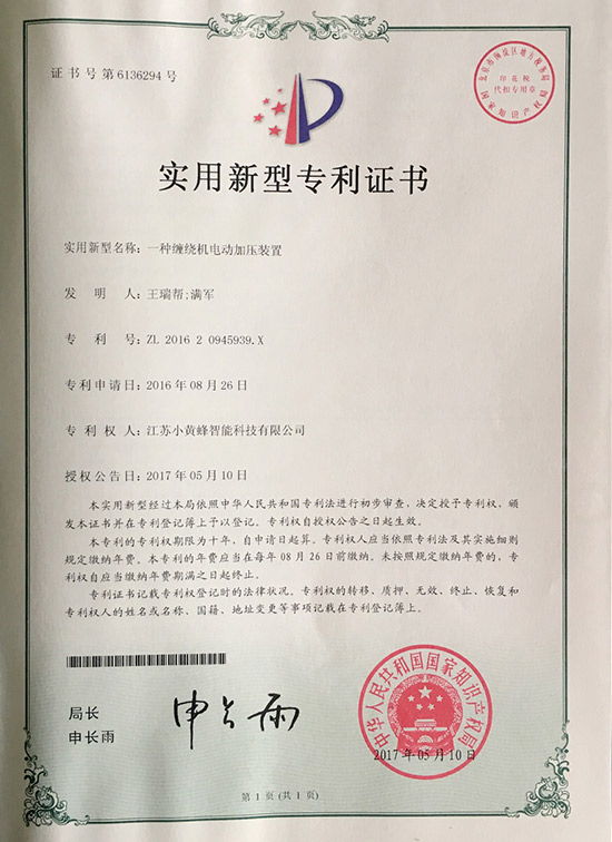 您的位置: 網(wǎng)站首頁 > 榮譽(yù)證書 > 小黃蜂-一種纏繞機(jī)電動(dòng)加壓裝置